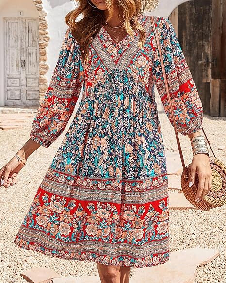 This Bohemian floral print dress (one size) is made from lightweight and breathable polyester fabric, providing a soft and comfortable touch that’s perfect for spring and summer. The vibrant ethnic-inspired print combines red, blue, and orange tones, giving the dress a vintage and artistic charm.