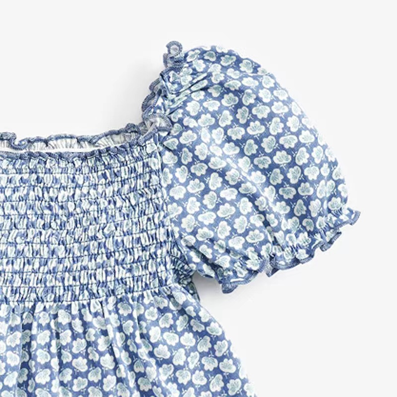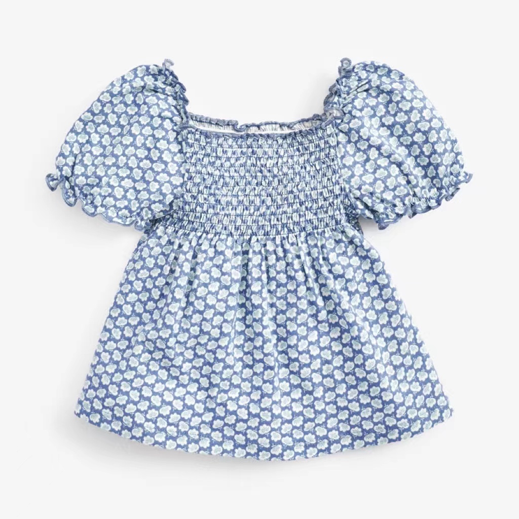 Blue Floral Baby Top with Puff Sleeves | Smocked Front Design · Soft & Breathable Cotton