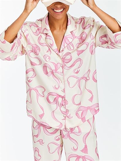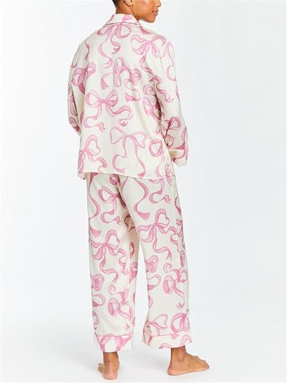 The set includes a long-sleeve button-up top and full-length pants, printed with charming pink ribbon patterns for a sweet and feminine touch. The top features a notched lapel collar and front buttons for easy wear, while the pants have an elastic waistband with adjustable drawstring for a perfect fit.