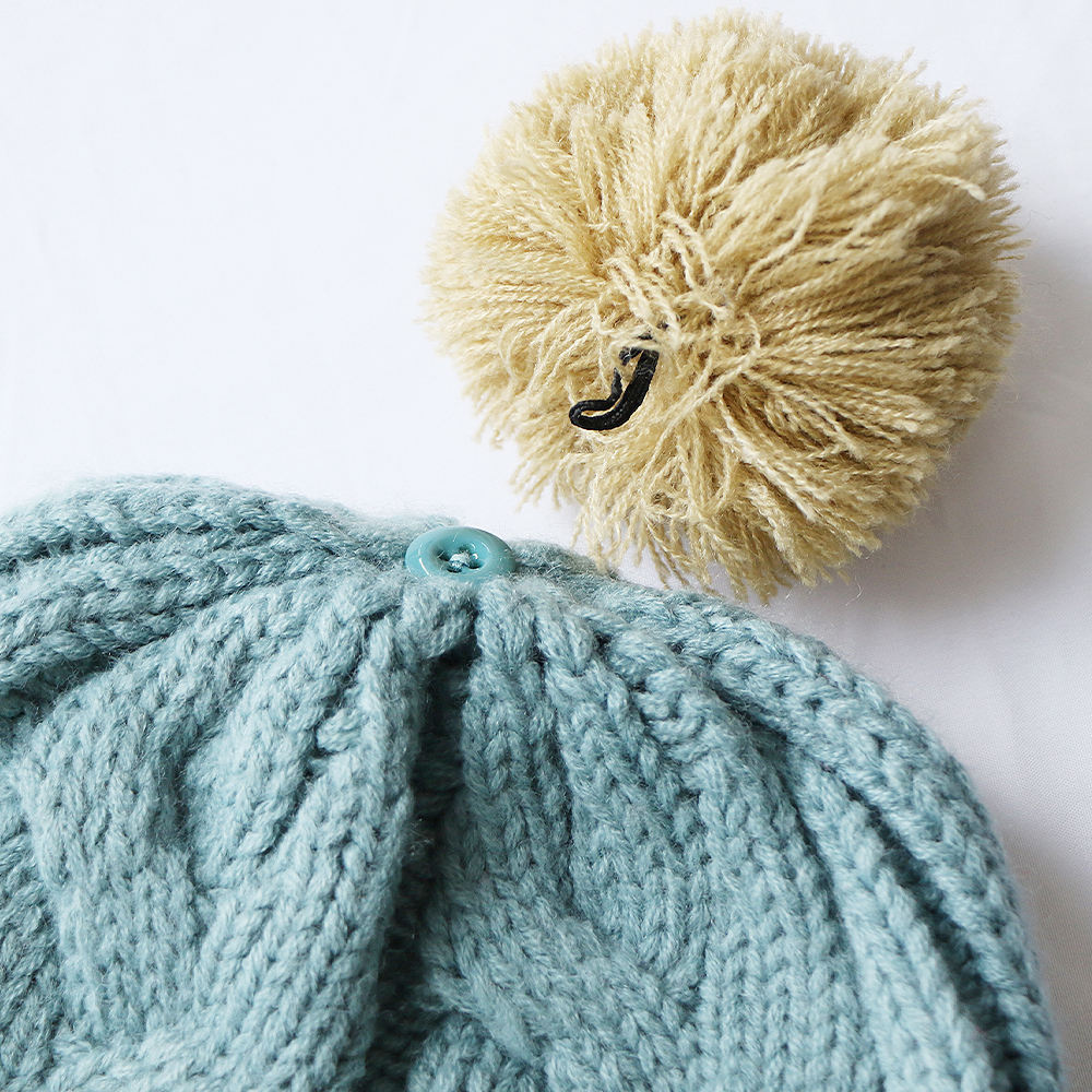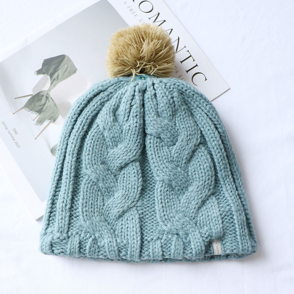 This light blue winter beanie features a classic cable-knit pattern and a fluffy faux fur pompom.
