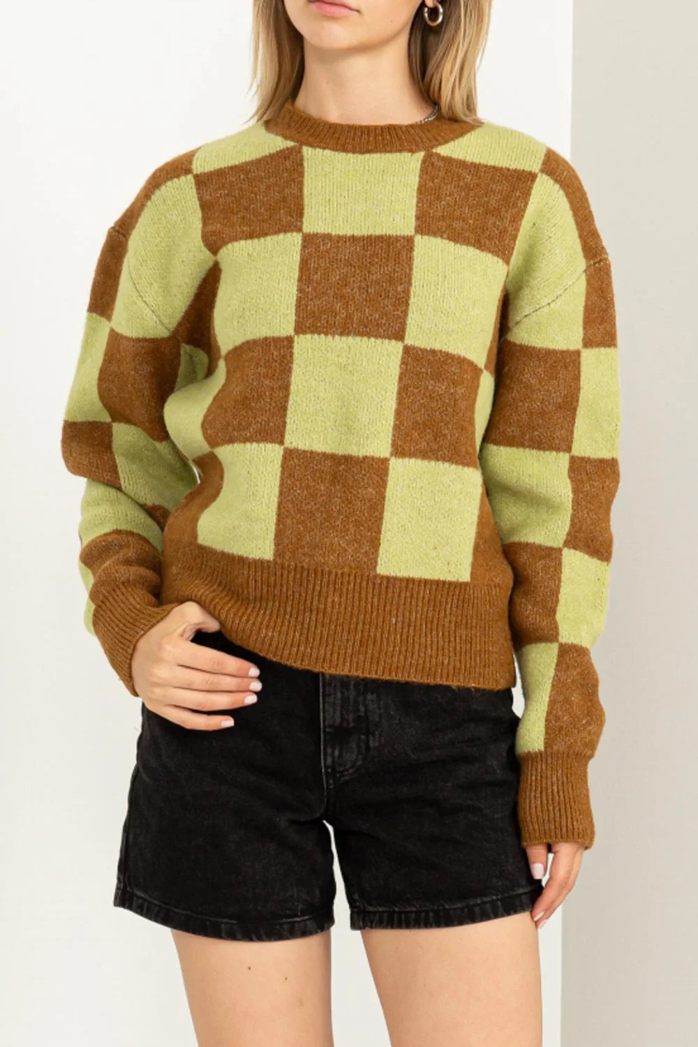 🖤 Features: Bold checkerboard pattern in trendy lime green and mustard colorway, ultra-soft knit construction for all-day comfort, classic crew neckline that’s perfect for layering or statement necklaces, cropped length that flatters every body type, long sleeves with ribbed cuffs for a polished finish, ribbed hem and neckline that maintain structure and shape, retro-inspired design with modern appeal, vibrant color combination that photographs beautifully for social media