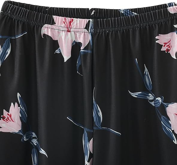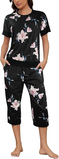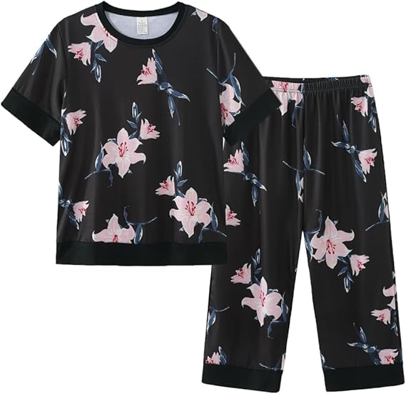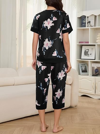 The set includes a short-sleeve top and cropped pants, featuring a relaxed fit for ease of movement. The elastic waistband provides flexibility and comfort, while the classic black base with pink floral print adds an elegant, feminine touch.