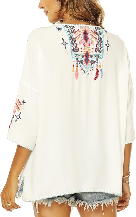 Made from a soft cotton-linen blend, the fabric is lightweight, breathable, and comfortable to wear. The loose-fit silhouette and 3/4 sleeves provide excellent movement and airflow, making it ideal for warm-weather days. The detailed embroidery on the front and sleeves adds a unique handcrafted appeal and highlights the boho aesthetic.