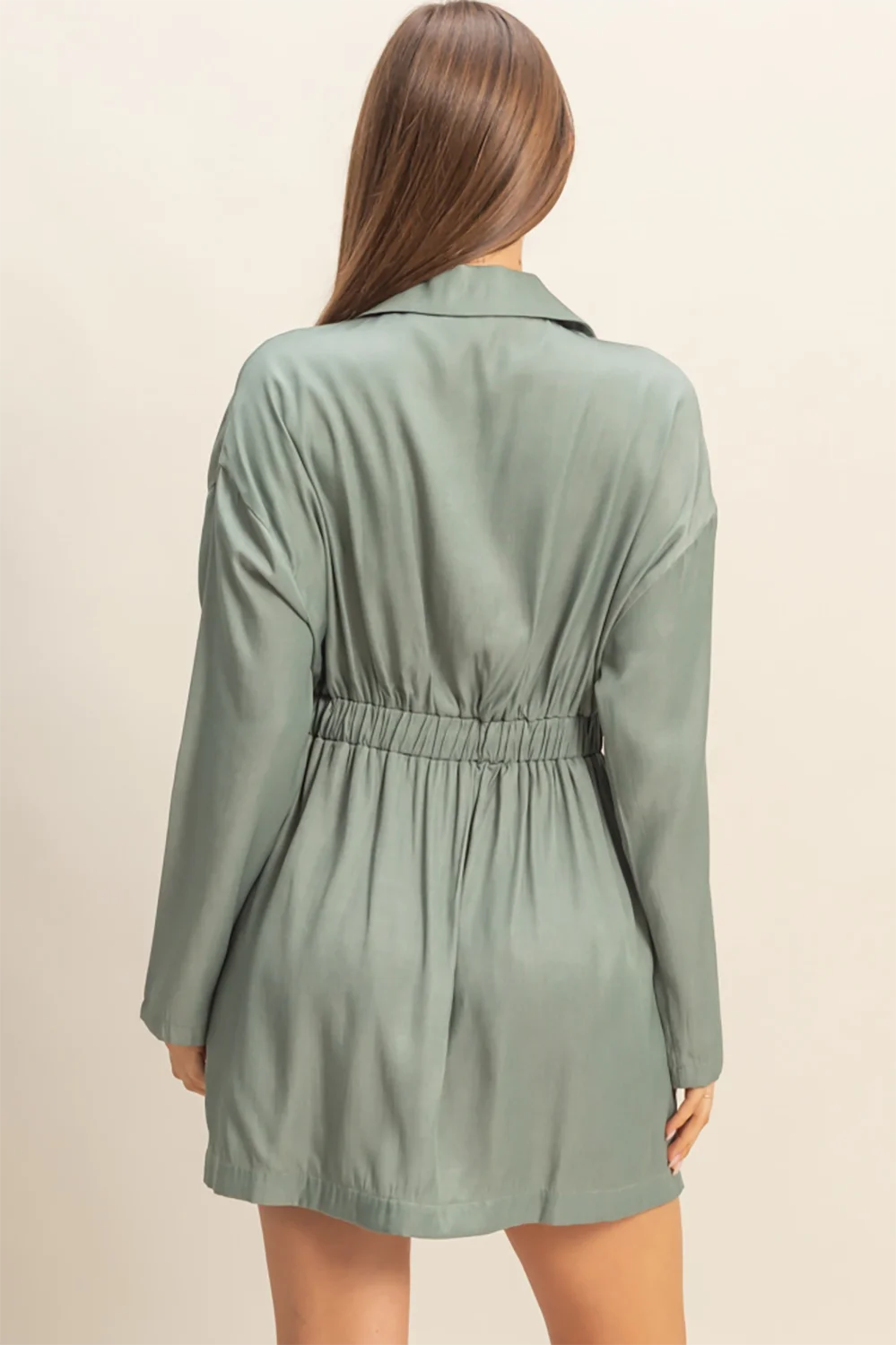 Long Sleeve Gold Button Ruched Waist Chambray Wrap Mini Shirt Dress