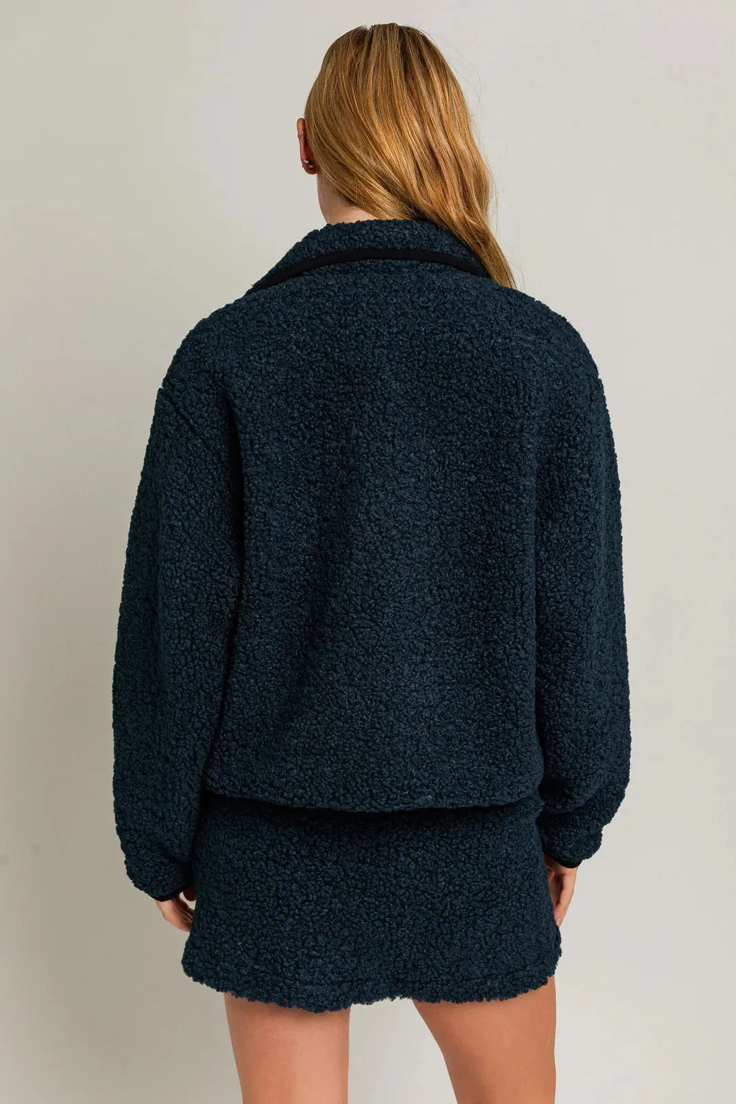Women jacket: sherpa, collared, button closure, two front pocket, short length, warm cozzy, cool. This winter, you’ll run into so many admirers with a toasty and stylish look like in our new chic jacket.