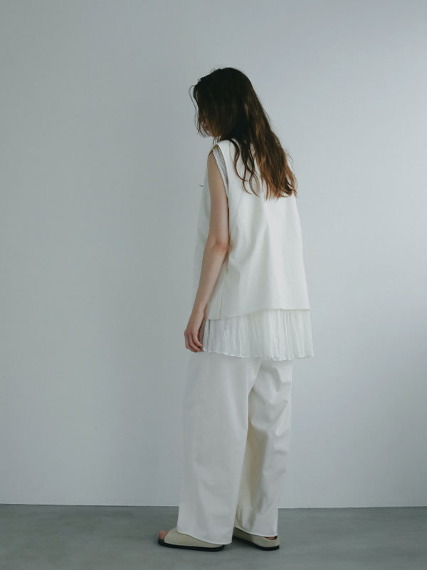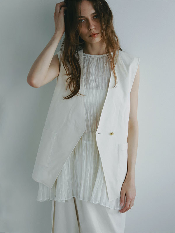 Two large patch pockets at the front enhance both practicality and visual balance, while the relaxed straight cut flatters the figure without adding bulk. The sleeveless structure allows for versatile styling — pair it with shirts, knits, or tees to easily transition from casual to refined looks.