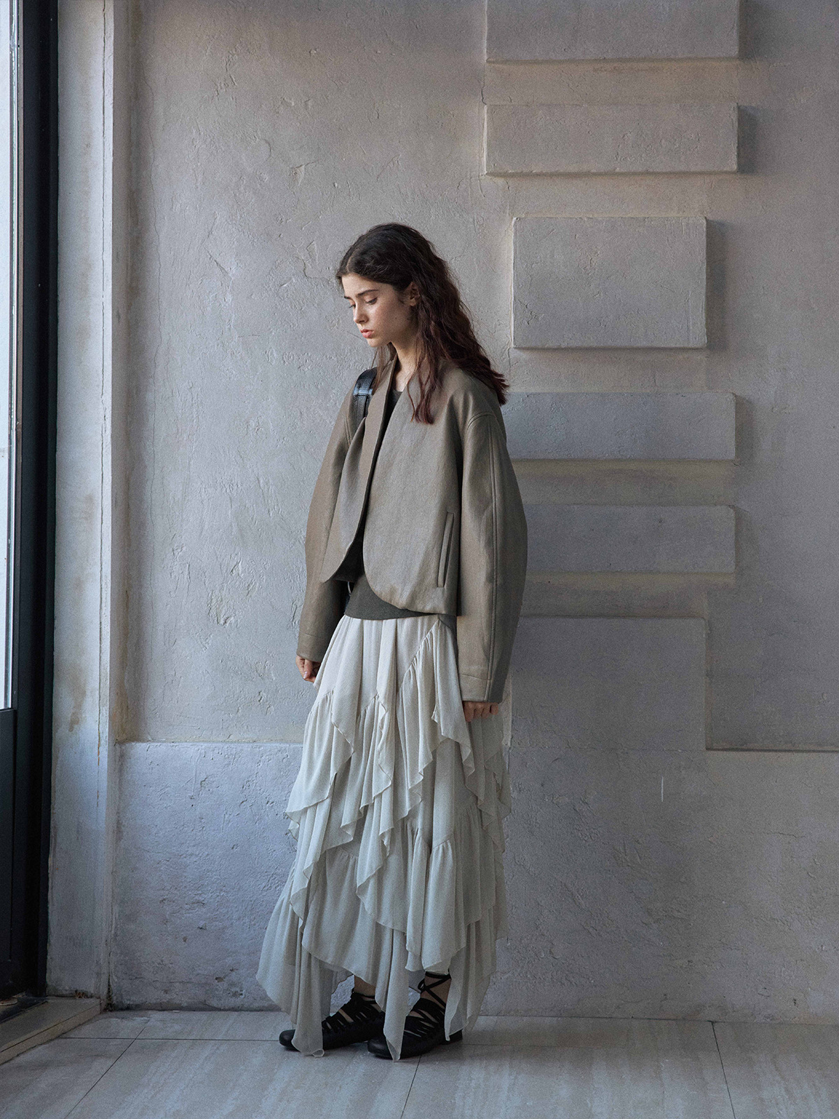The collarless curved front design breaks away from traditional blazer stiffness, exuding quiet sophistication. The drop-shoulder cut and slightly tapered sleeves create a balanced and fluid shape, while the cropped length subtly raises the waistline for a flattering proportion.
