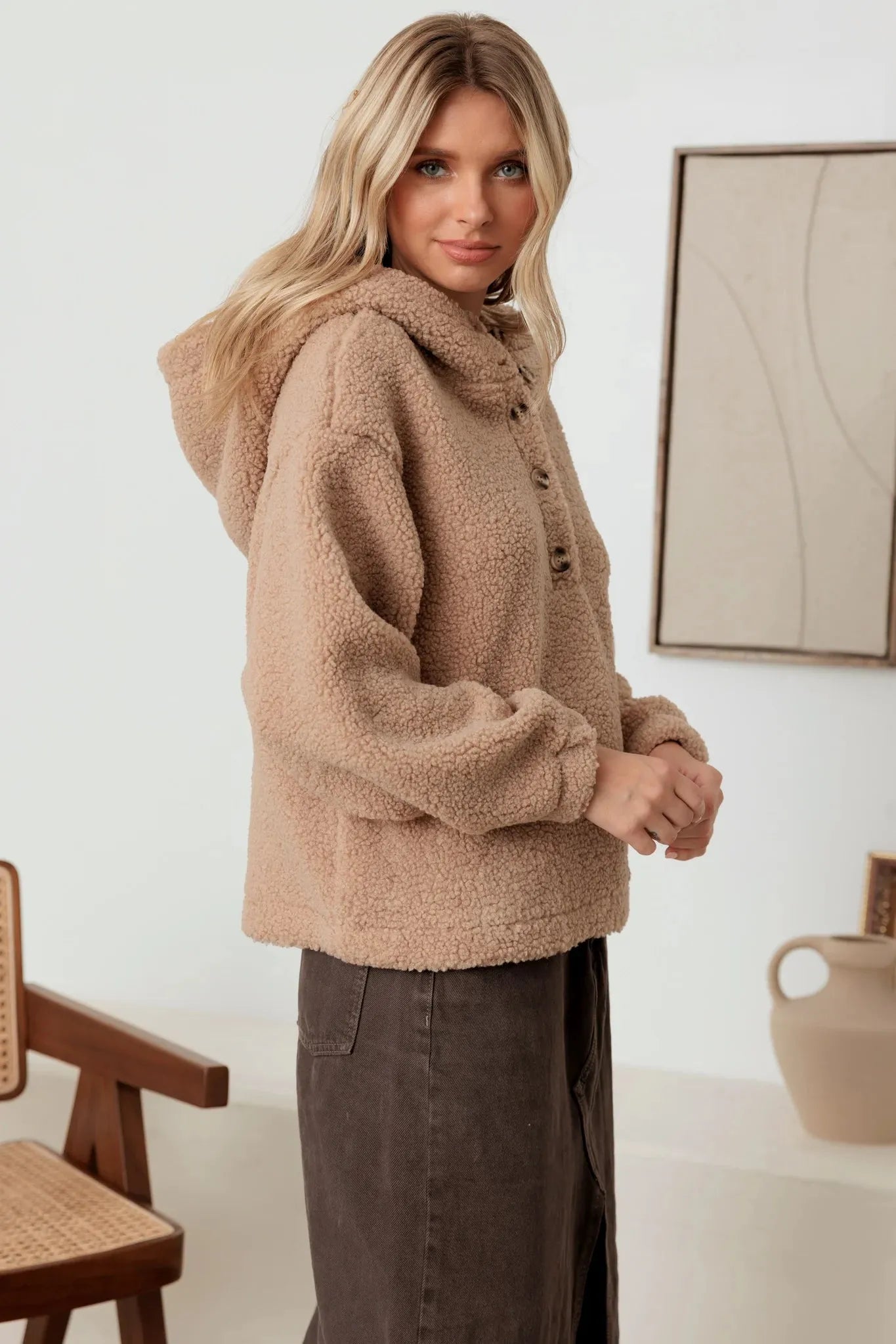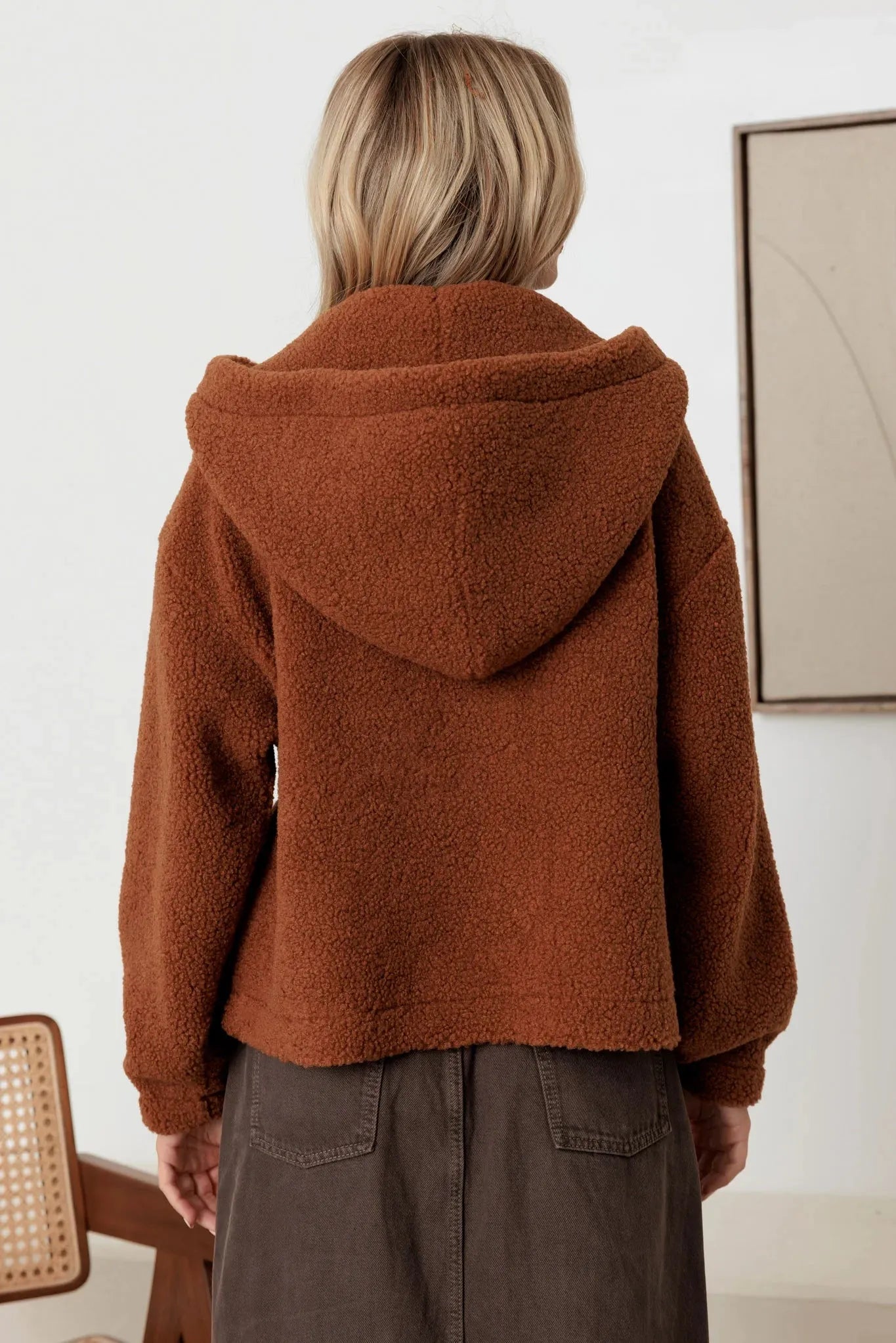 Women jacket:solid color, sherpa, long sleeves, dropped shoulders, contrast button-up neckline, hooded, two pockets, relaxed fit, cropped length, semi-stretchy, unlined, casual, cute, warm, cozy. Style this for an effortless look. This is sure to be your new favorite go to!