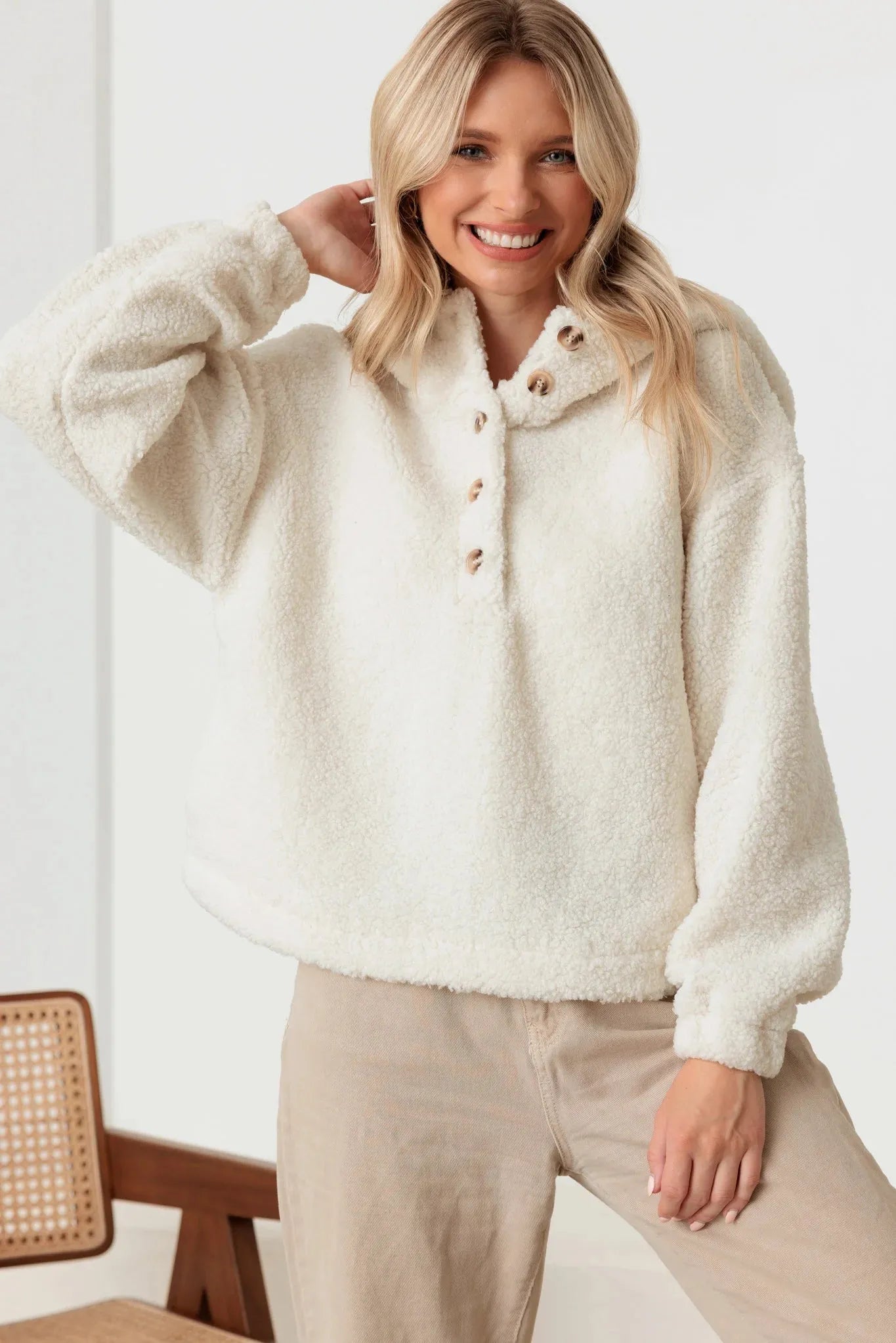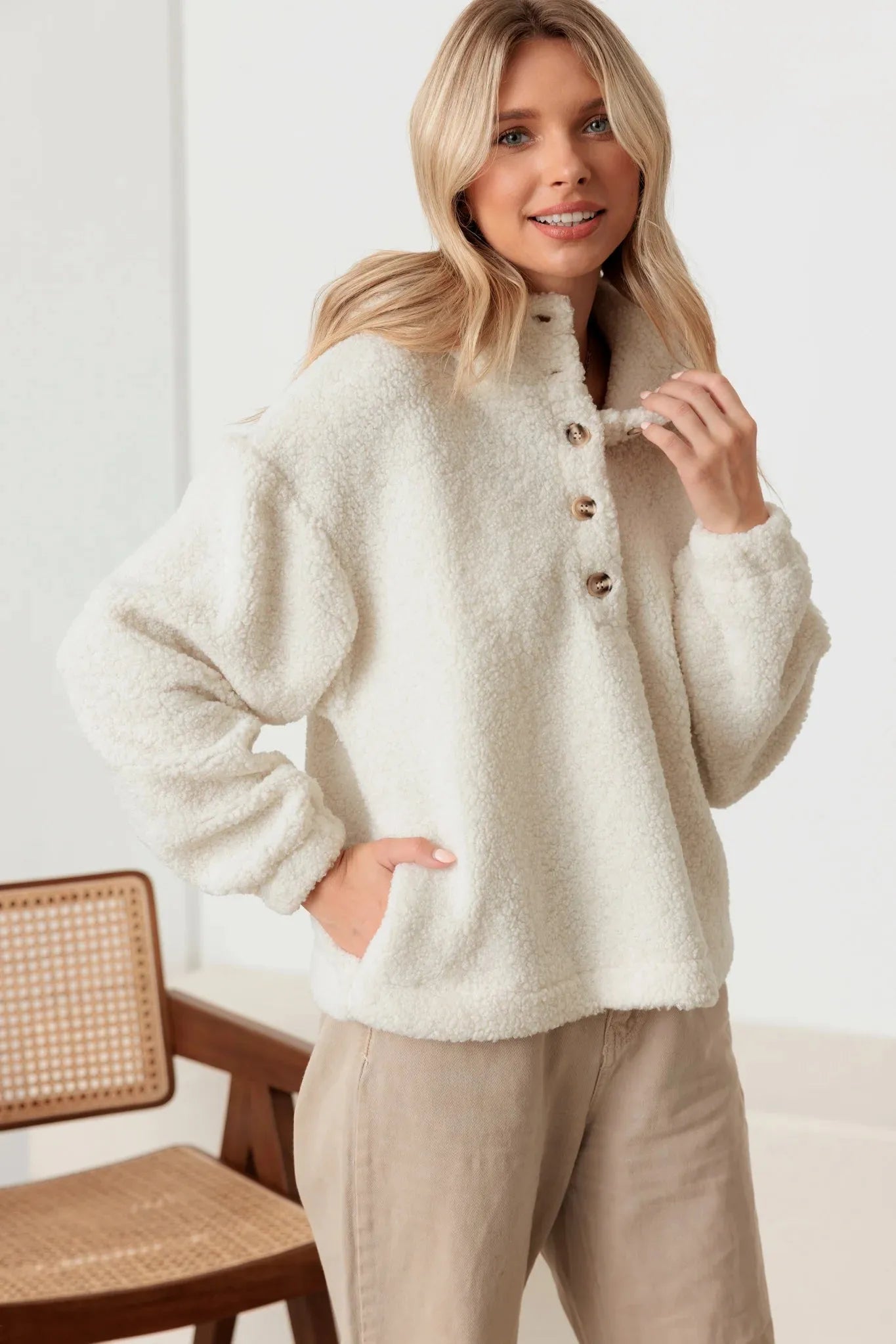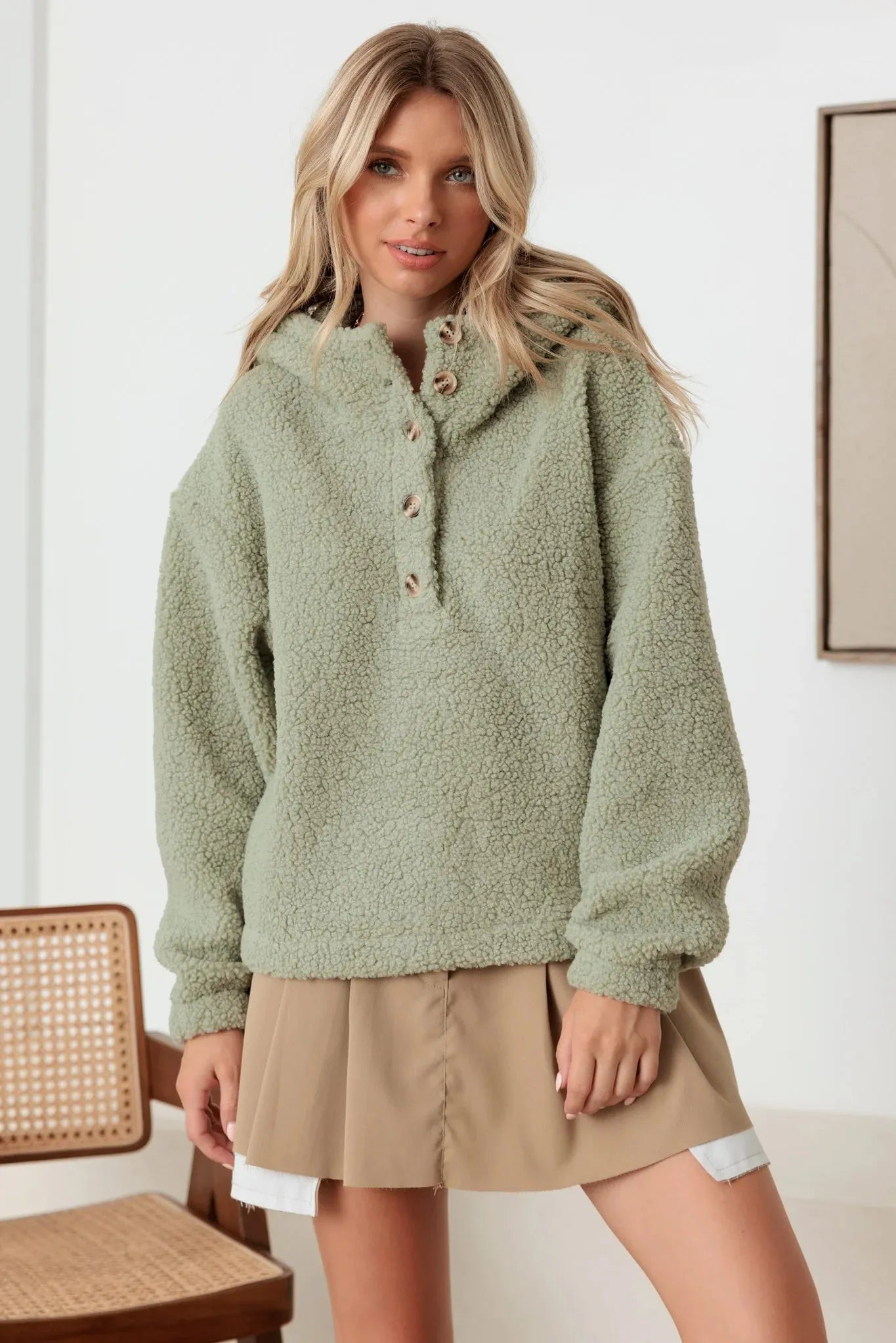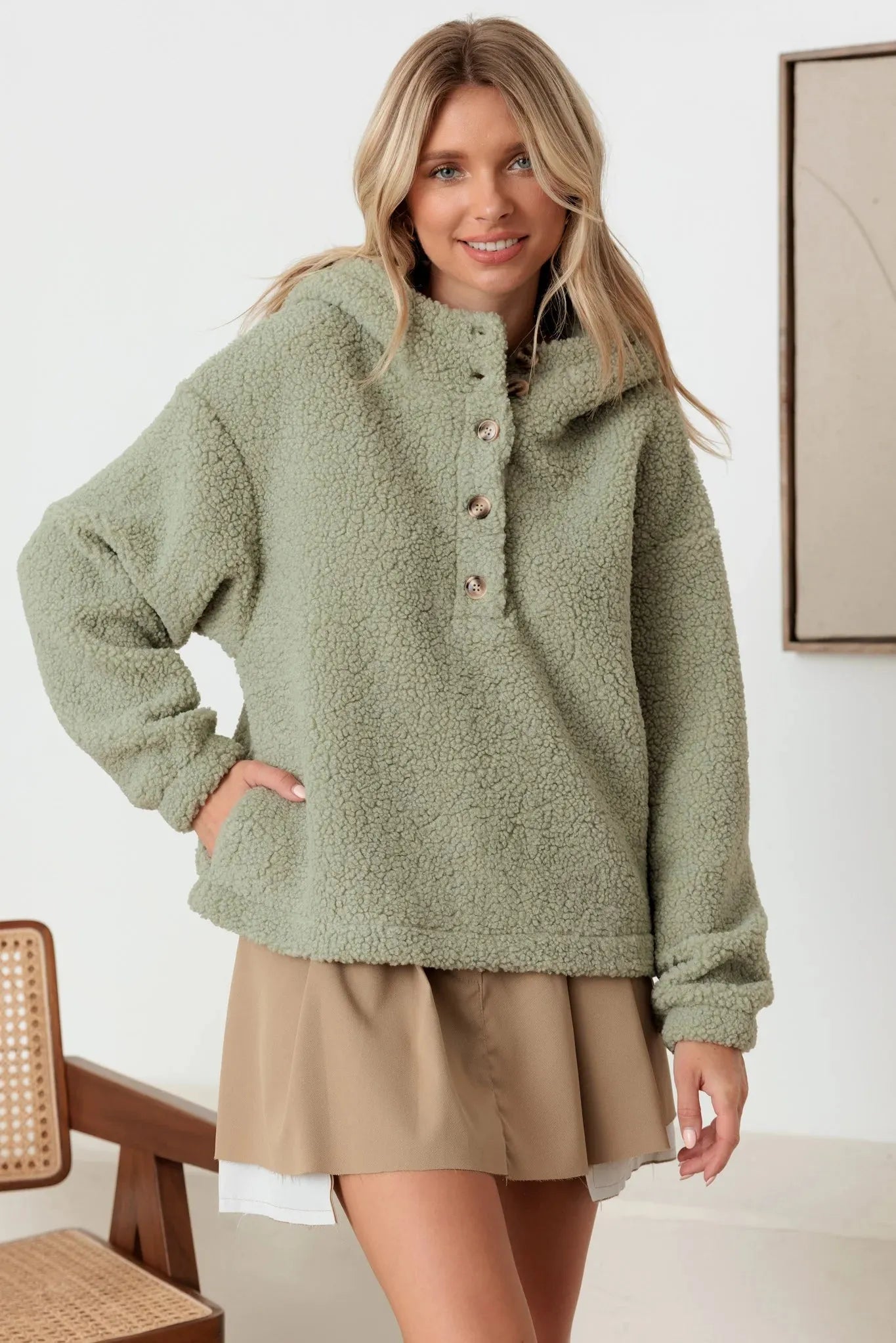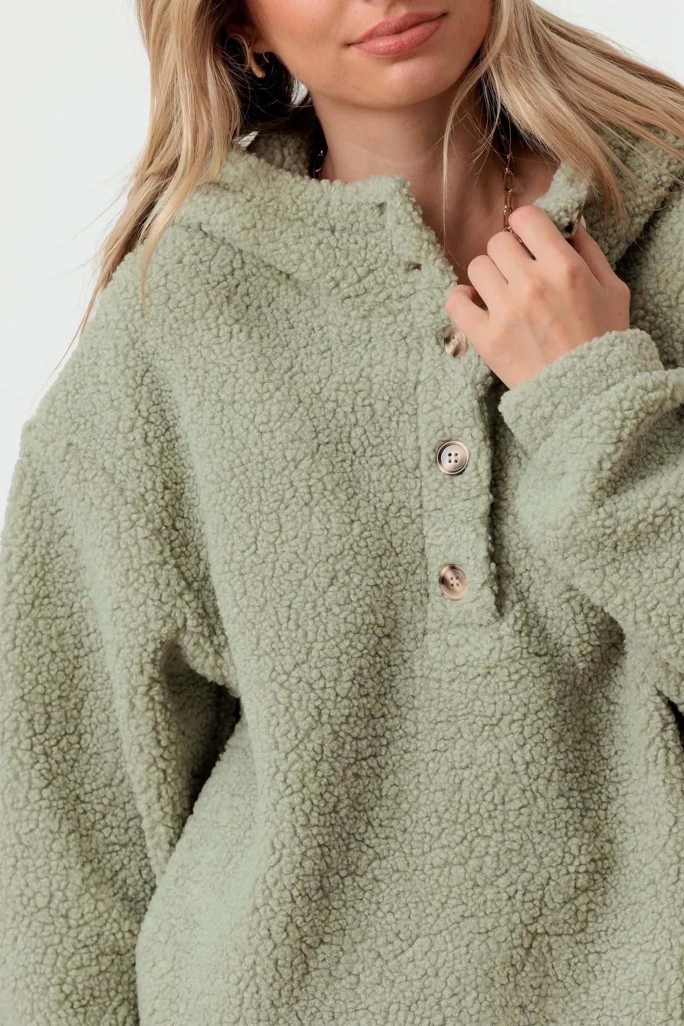 Sherpa Button-Up Two Pocket Hooded Pullover Jacket