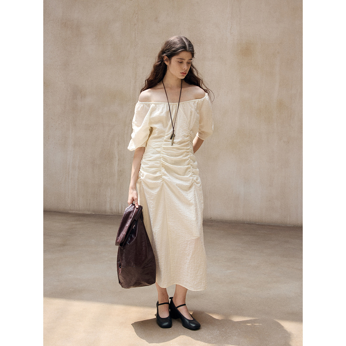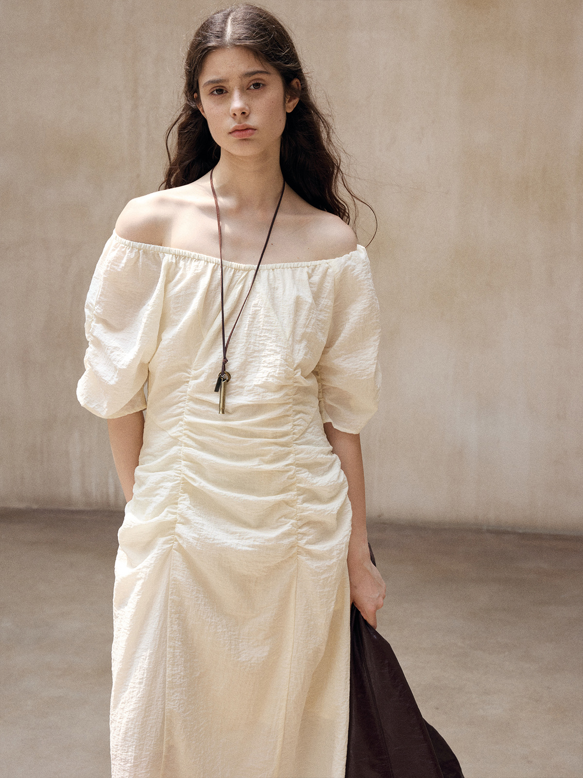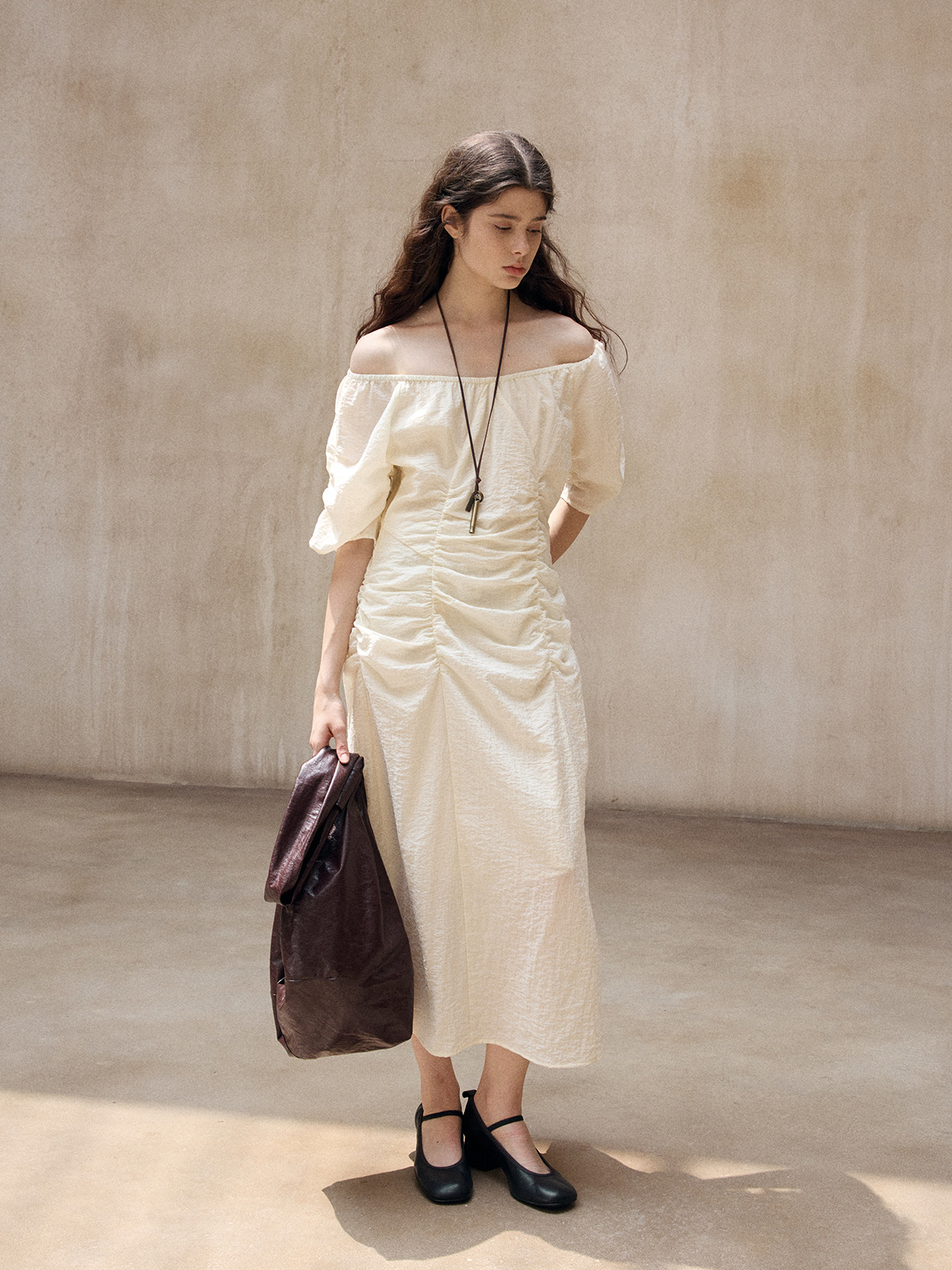 This off-shoulder ruched dress embodies minimalist romance and timeless femininity, blending elegance with comfort. Crafted from lightweight cotton-blend fabric with a subtle textured surface, it feels soft against the skin and drapes beautifully with a natural crinkled effect.