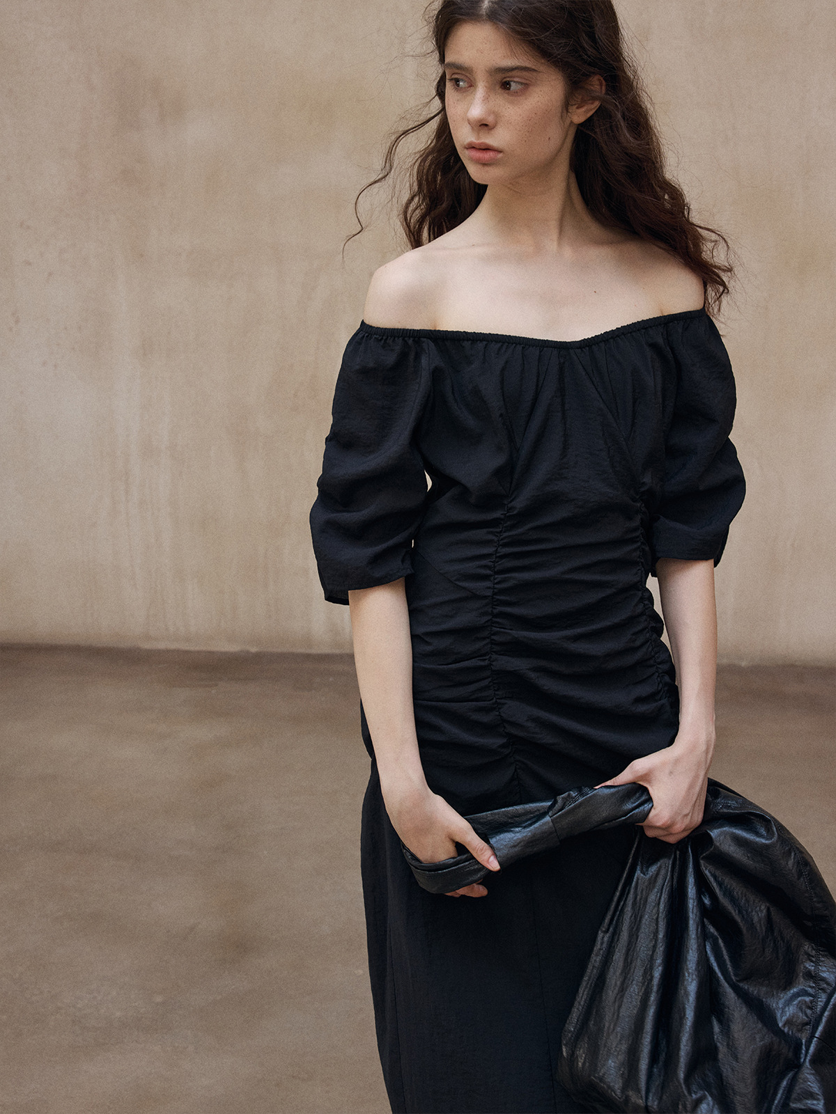 The off-shoulder neckline highlights the collarbone and shoulder line, while the ruched front and back panels sculpt a flattering silhouette that enhances natural curves. The puff sleeves add volume and balance, giving the look both softness and sophistication.