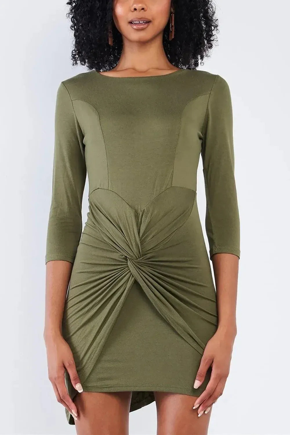 Olive Green 3/4 Sleeves Twist Front Bodycon Mini Dress
