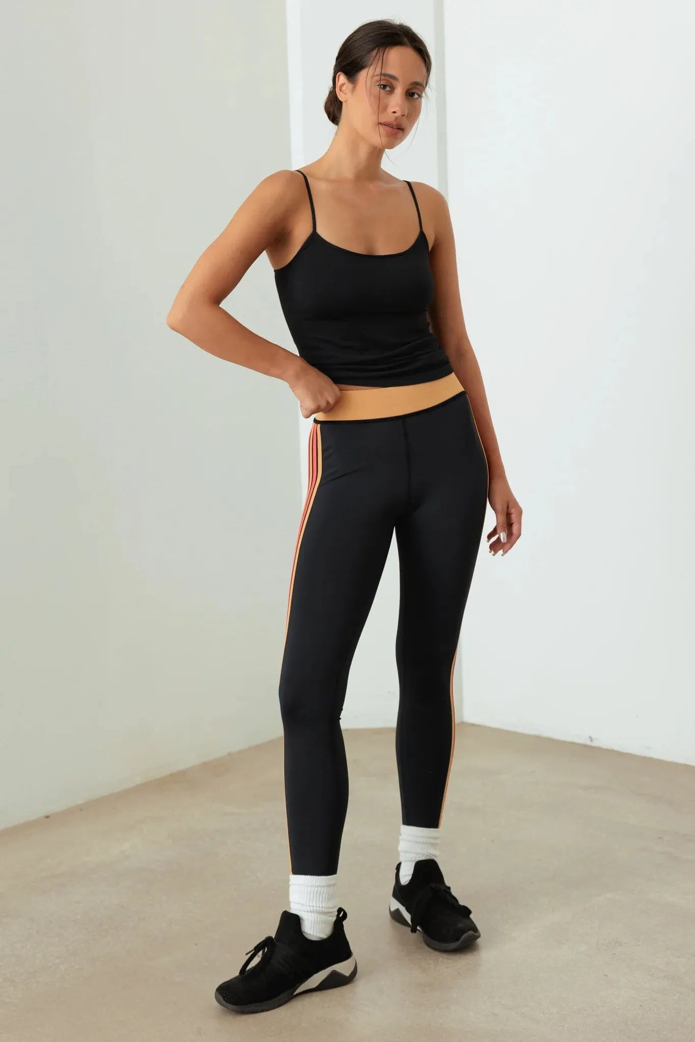 🖤 Features: High-waisted design, colorful side stripes, stretchy black fabric, moisture-wicking material, figure-flattering fit, full-length style, wide waistband