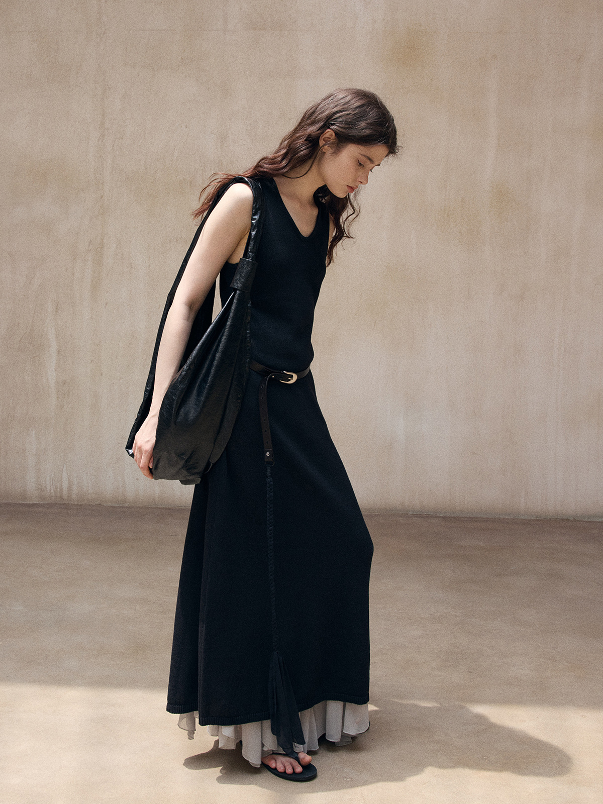 This sleeveless knit hooded dress draws inspiration from modern minimalism, combining comfort, structure, and effortless elegance. Crafted from soft, stretchy knit fabric, it gently hugs the body without feeling restrictive, offering a naturally flattering silhouette.