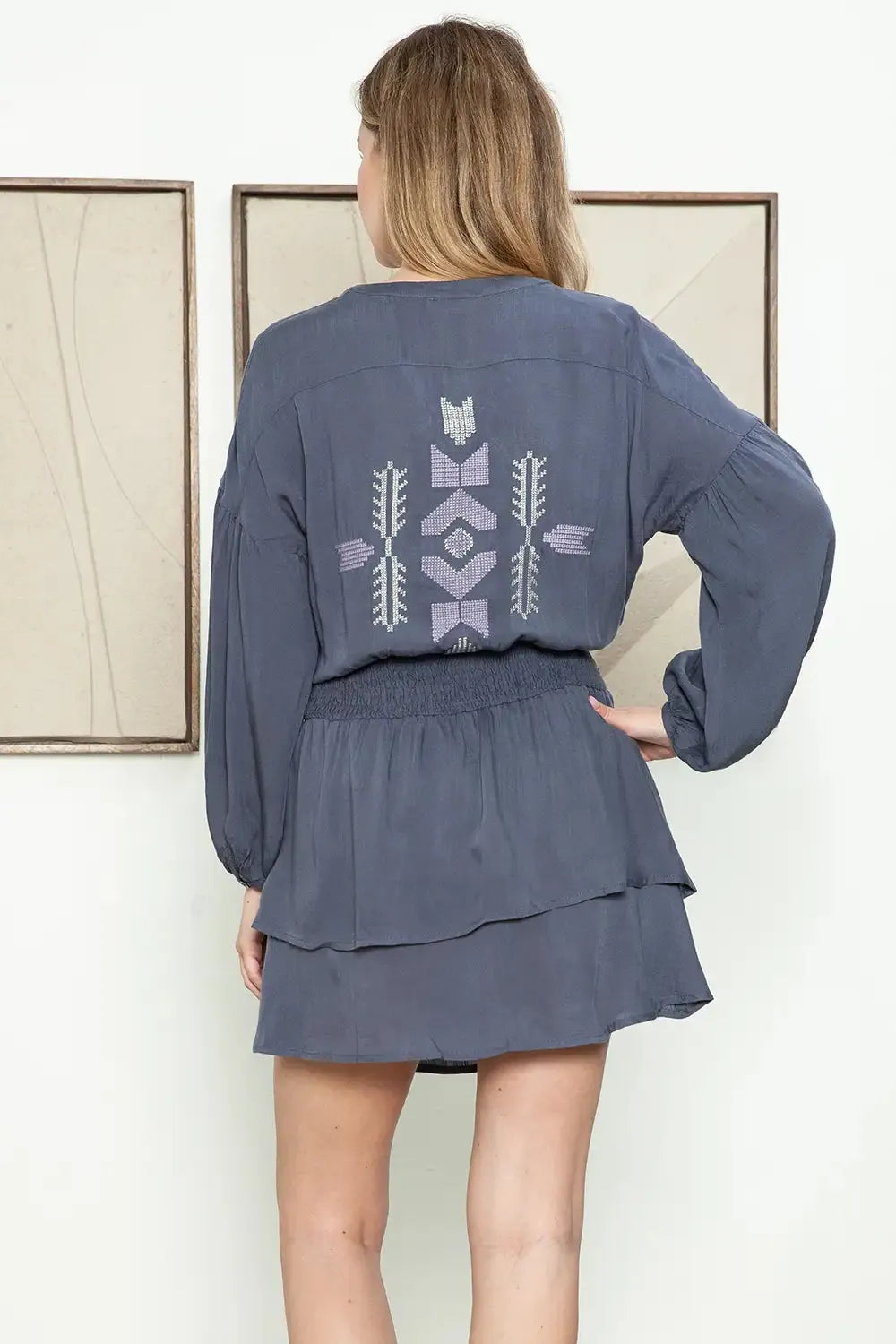 Boho Western Long Sleeve Embroidered Back Front Button Tiered Mini Dress