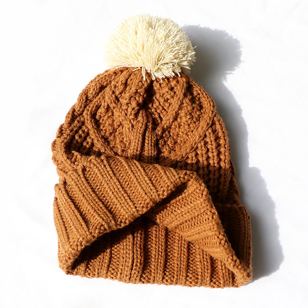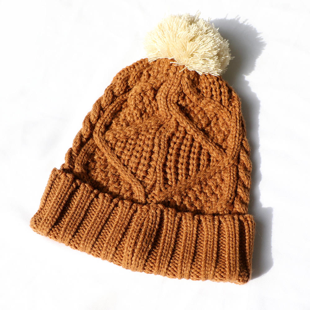 This cozy winter beanie features a classic cable-knit texture and a fluffy pompom on top.